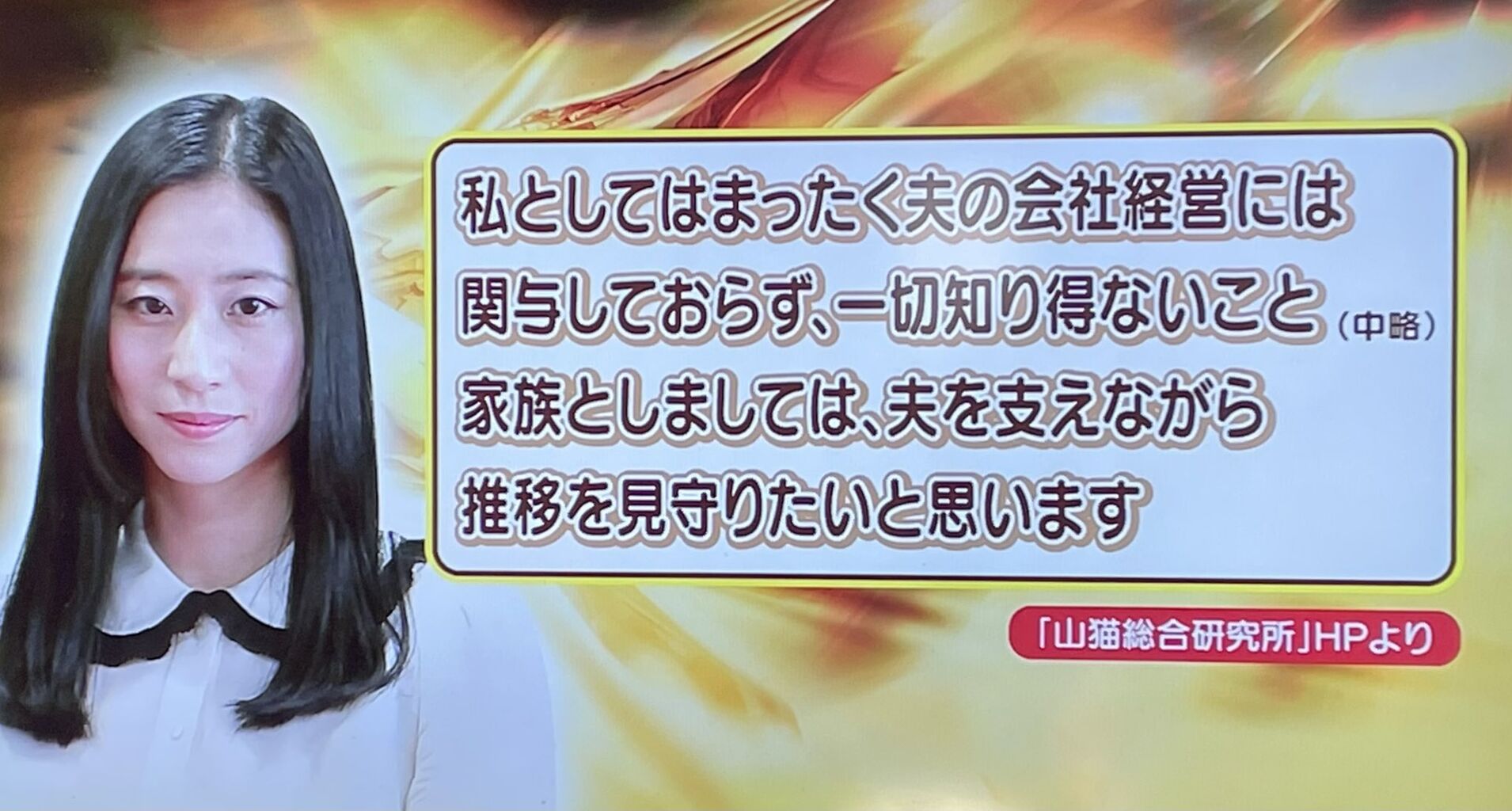 「私自身が夫の会社の経営に一切関与しておりませんため、詳細を知りません。そして、捜査中のことについてコメントするのは控えてほしいと言われているので、そういった事情からコメントを述べることは困難ですがご心配おかけしております」